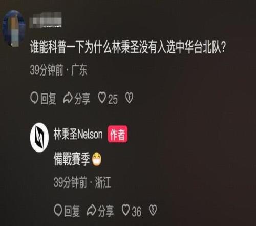 林秉圣此前曾中選中國臺北男籃代表隊,但在此次窗口期落選,無緣出戰世預賽,有球迷在評論區訊問為什么落選,林秉圣回復道是為了備戰賽季。